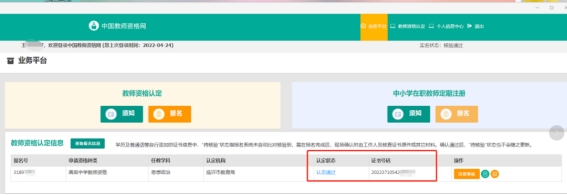 教师资格认定网上申报后,登陆中国教师资格网(https://www.jszg.edu.cn/),通过“教师资格认定申请人网报入口”进入个人账号后,即可查看认定状态,认定通过的证书号码在右侧一并显示。