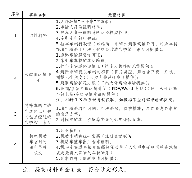 (一)全面梳理事项清单。编制事项实施清单,将大件运输“一件事”涉及行政审批、公安2个部门的公路超限运输许可、特型机动车临时行驶车号牌核发、特殊车辆在城市道路上行驶(包括经过城市桥梁)审批3个业务事项,按照政务服务事项标准化要求进行全面梳理,完善服务事项核心内容要素,明确实施依据、适用范围、申请材料等要素,统一规范“一件事”事项内容和形式,确保实施清单准确性和完整性。(牵头单位:市行政审批服务局,责任单位:市交通运输局、市公安局,各县区行政审批服务局,完成时限:9月底)