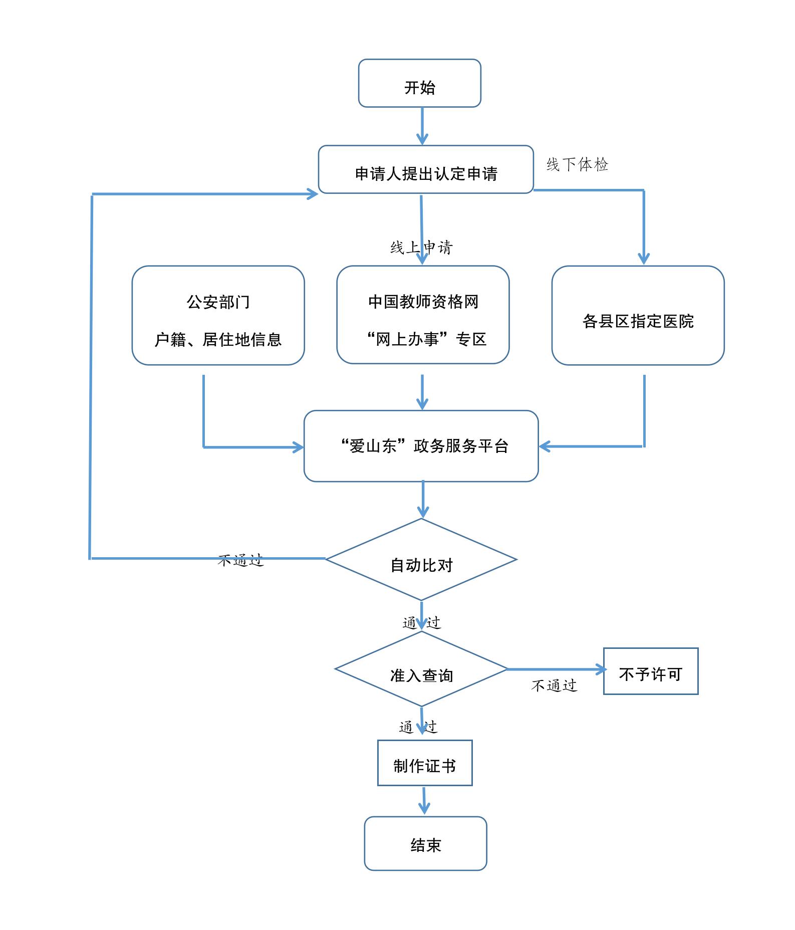 1.开发功能模块。依托“爱山东”政务服务平台,开发建设“教师资格认定审批”工作模块,接收、汇集中国教师资格网的申请数据、医疗机构的体检信息、公安部门的户籍(居住地)信息,实现申请人数据信息智能化比对,自行判定教师资格认定结果。(责任部门:市行政审批局、市大数据局)